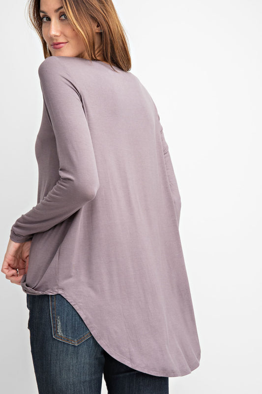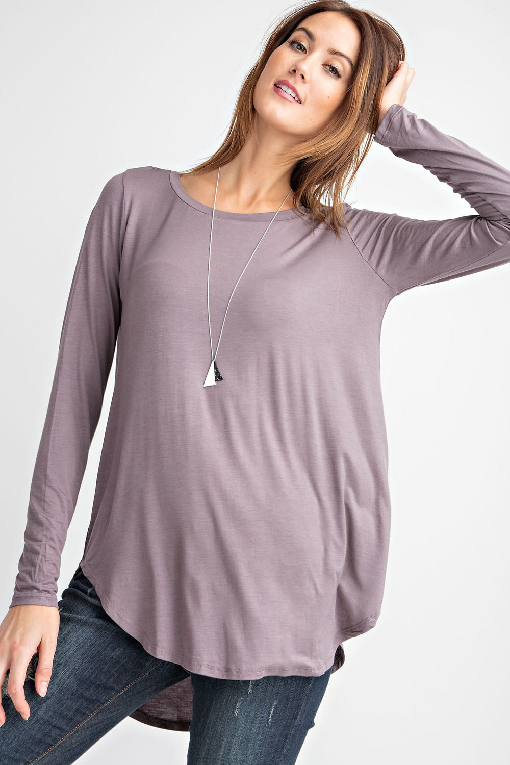 The butter material on this simple round neck long-sleeve top is one you will love putting on every day. Worn as a simple top with leggings or jeans or paired with a distressed denim jack for a chilly morning you will want this staple in your closet.