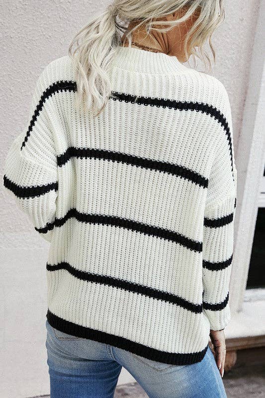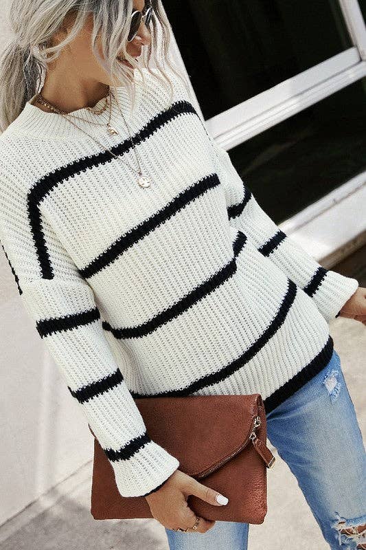 Elevate your winter wardrobe with our Black Stripe Knitted Sweater. This lightweight, cozy sweater features a classic crew neck and long sleeves with banded cuffs, making it a timeless addition to your collection. Its relaxed fit ensures comfort without compromising style, and it falls gracefully at hip length. With a sophisticated black stripe pattern, this sweater effortlessly combines warmth and fashion, making it a versatile choice for any occasion.