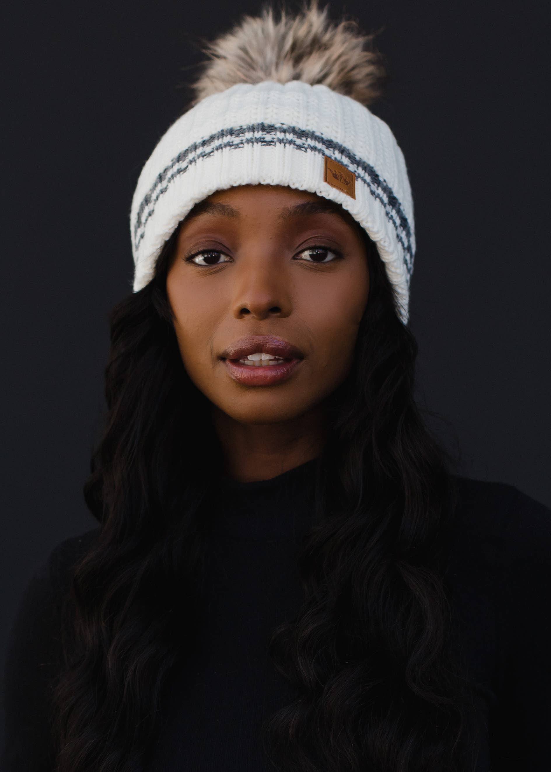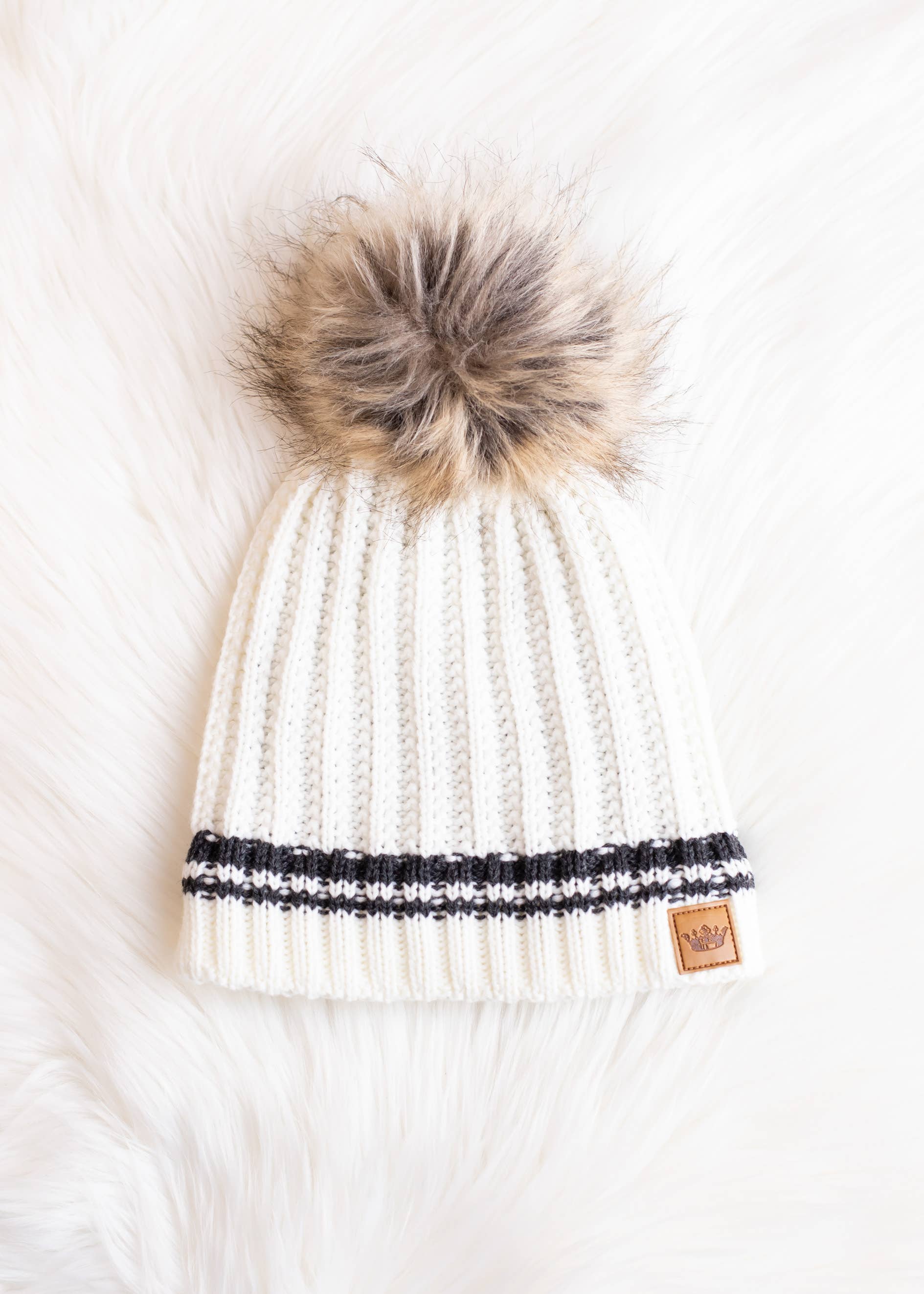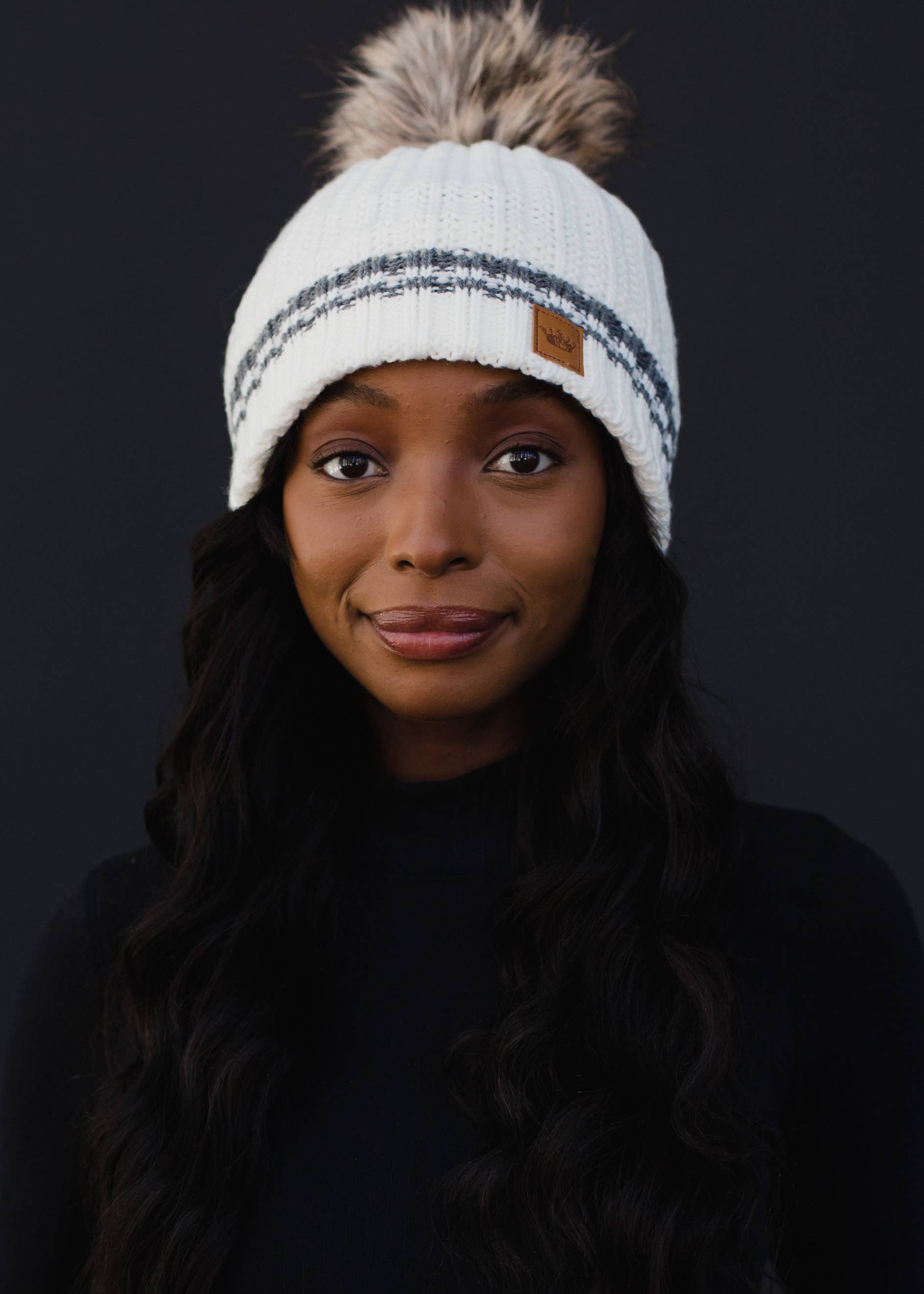 Cream knit hat with dark gray stripe Natural faux fur pom accent Fleece lined