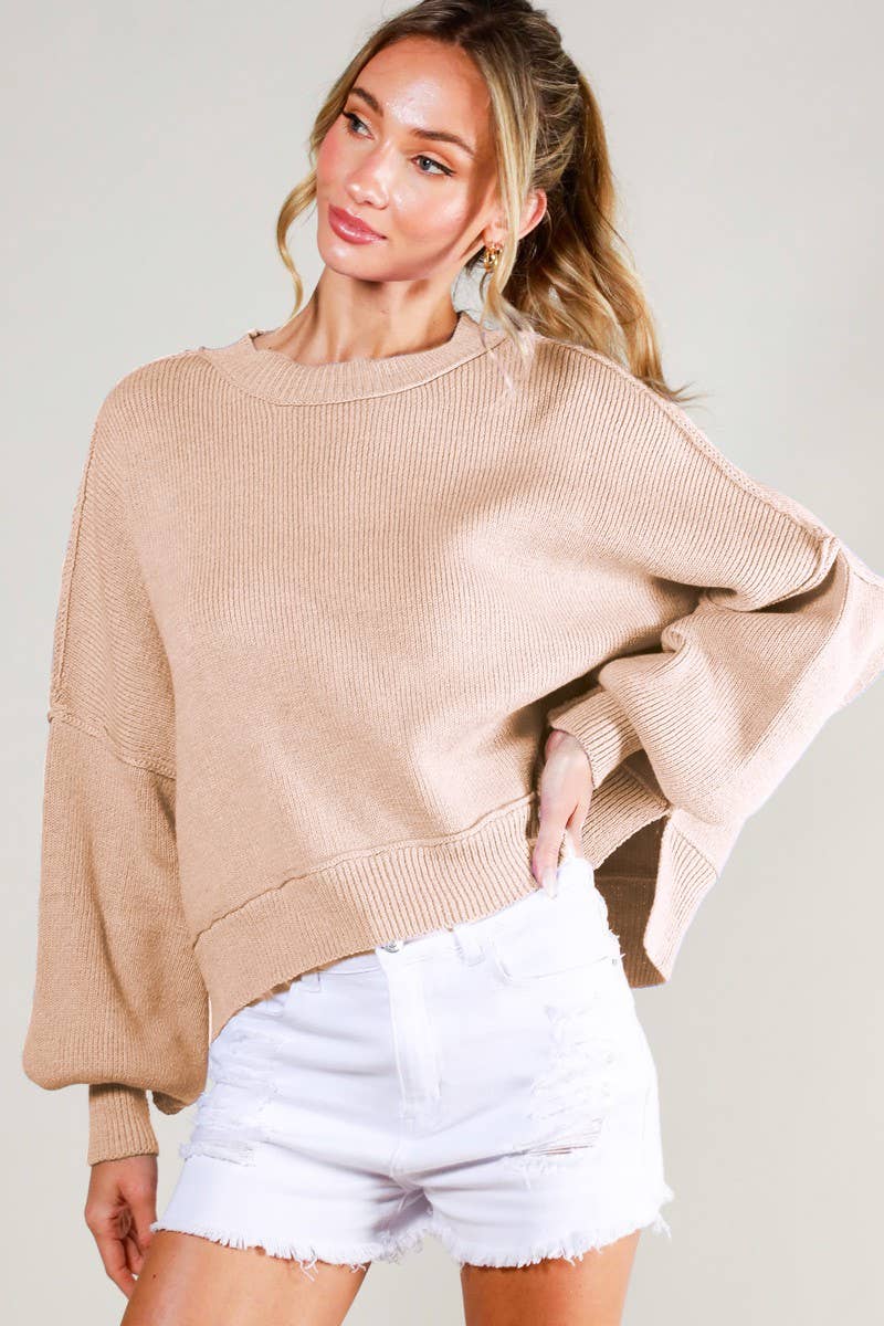 Drop Shoulder, balloon sleeve knit sweater is a perfect transition into fall. With a slightly oversized fit, this is an easy throwover with a pair of shorts, or dress up with our stretch pants.