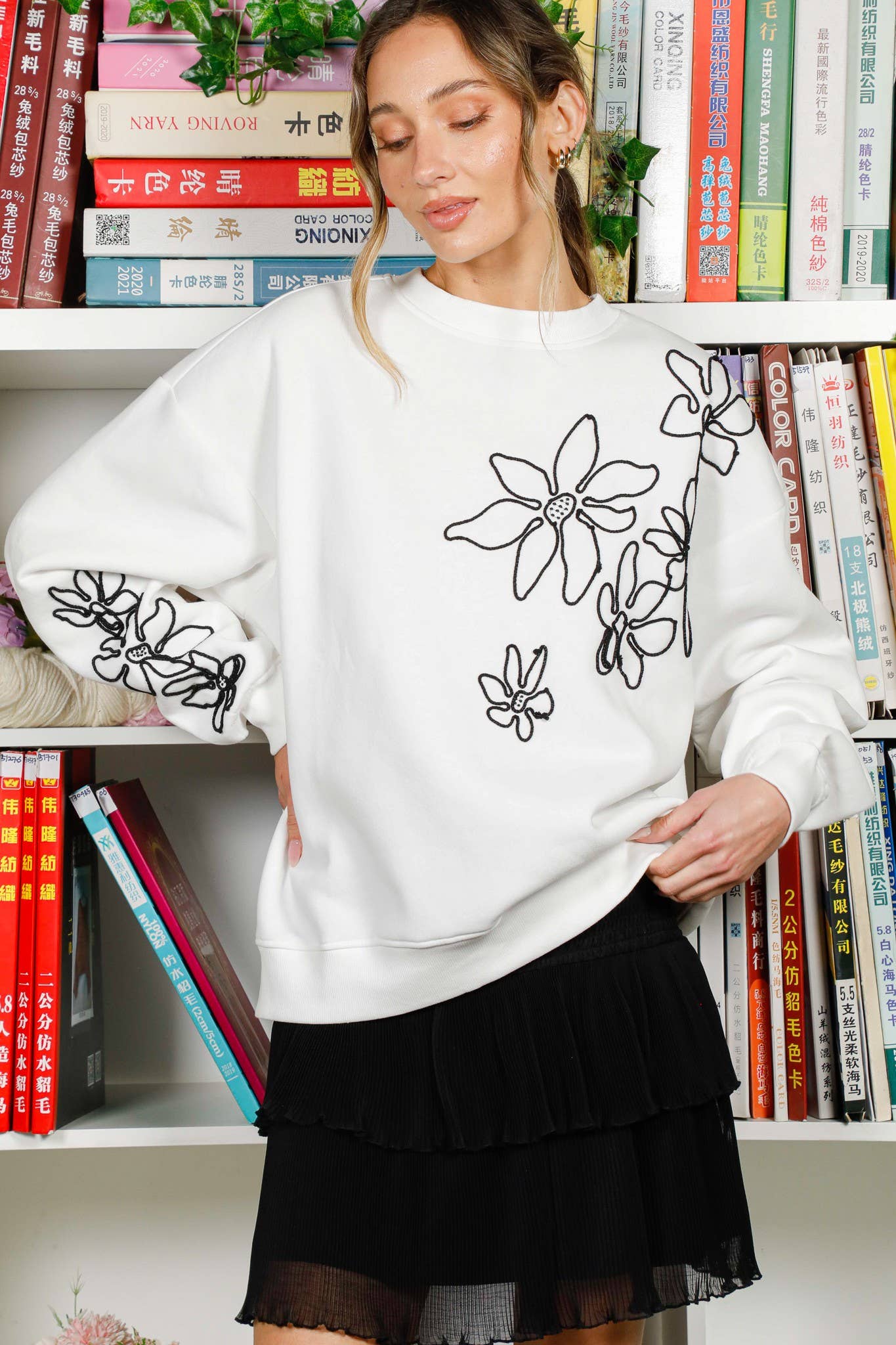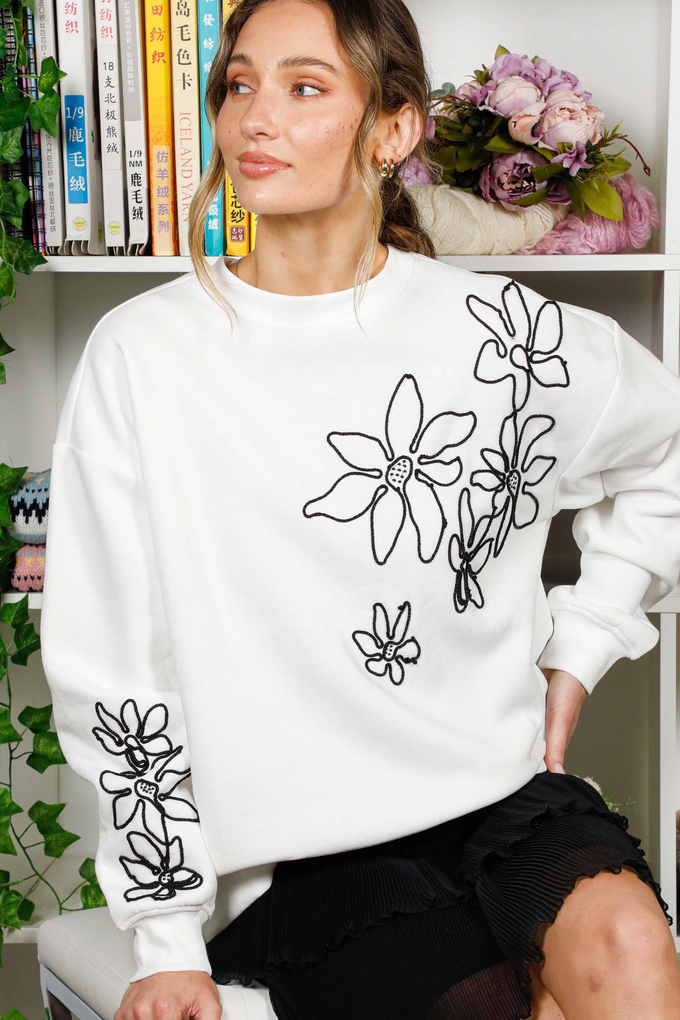 Thicker, floral embroidered detail sweatshirt with drop shoulders and ribbed hem. Super soft and a great transition piece from summer to fall. Paired with our black raw shorts or jeans, you will get a lot of wear out of this sweatshirt.