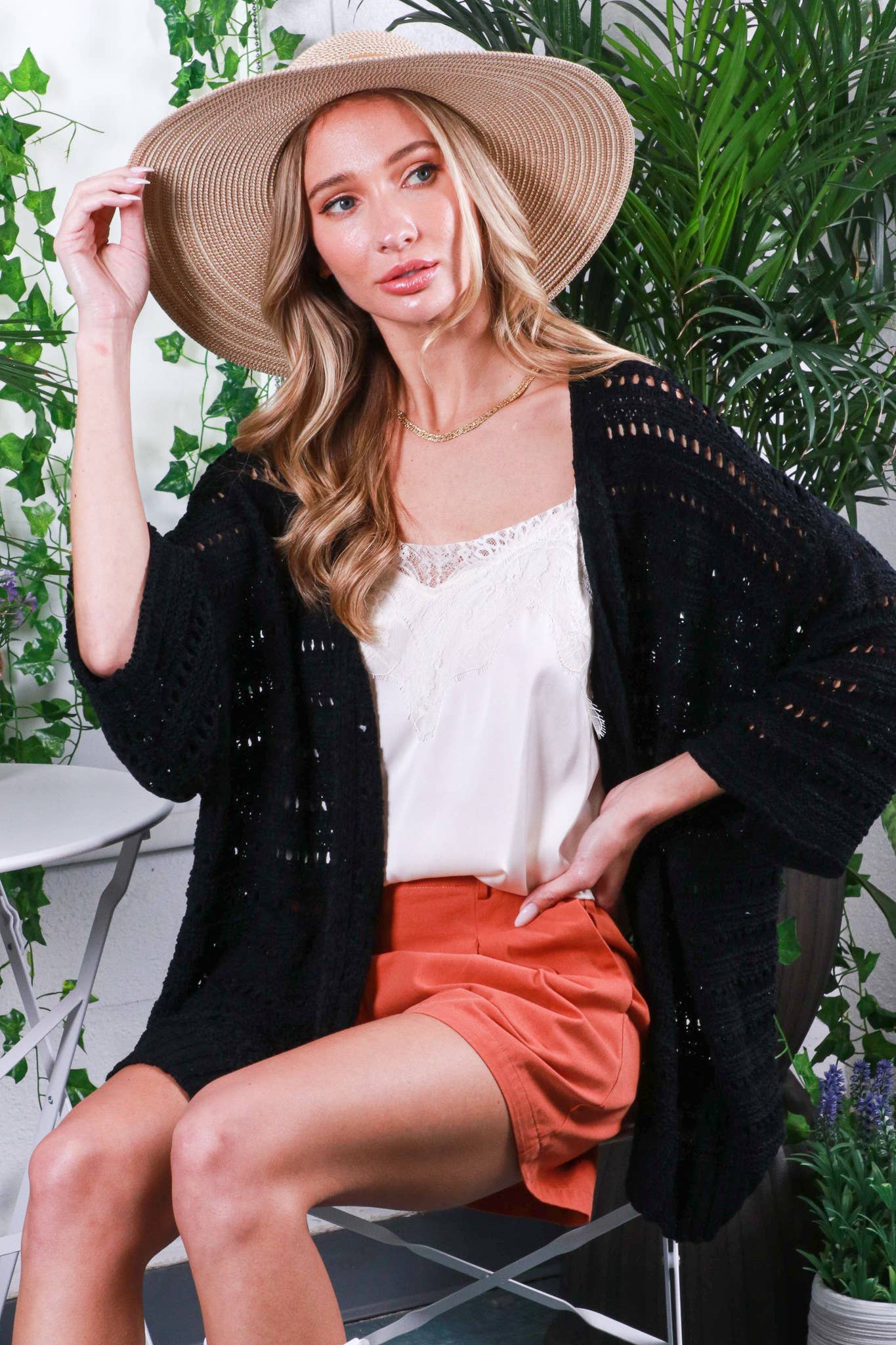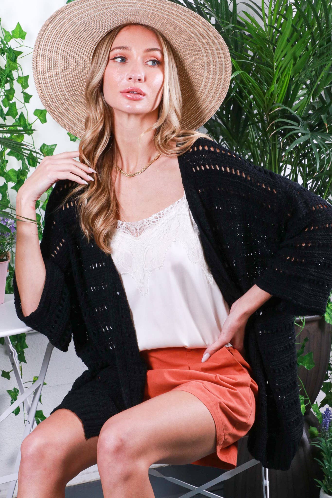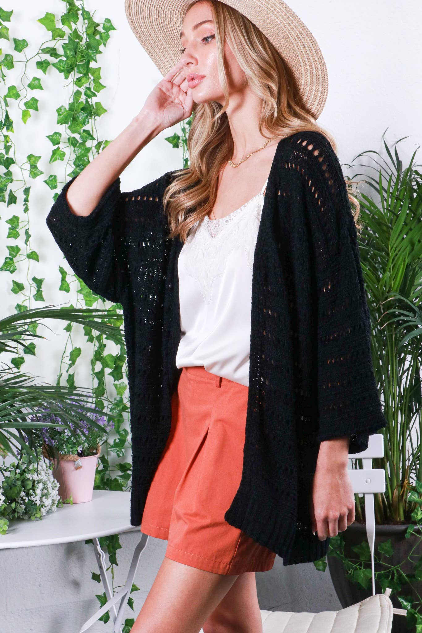 Drop shoulder 3/4 sleeve crochet cardigan with ribbed hem. Batwing-style sleeves are perfect for any style you have.