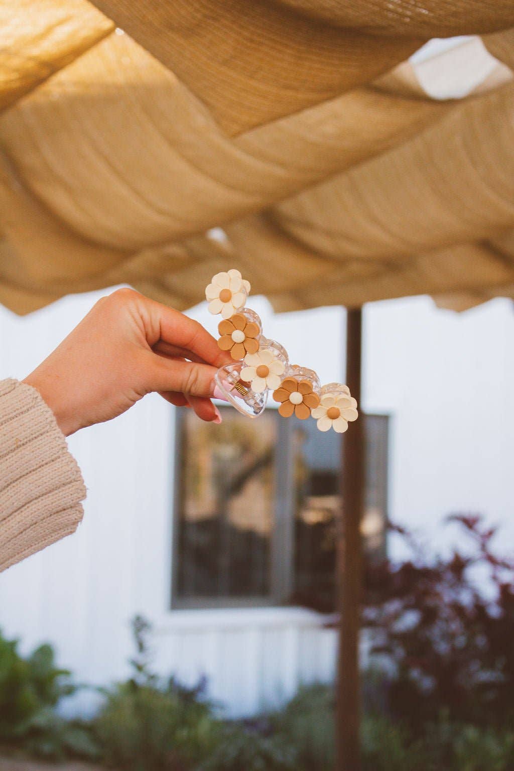 This best selling blossom claw clip is now here in our new brand colors! Each side has 5, 3-D flowers in cream and tan, making it the perfect neutral clip for everyday wear. It is large in size, measuring 4 inches.