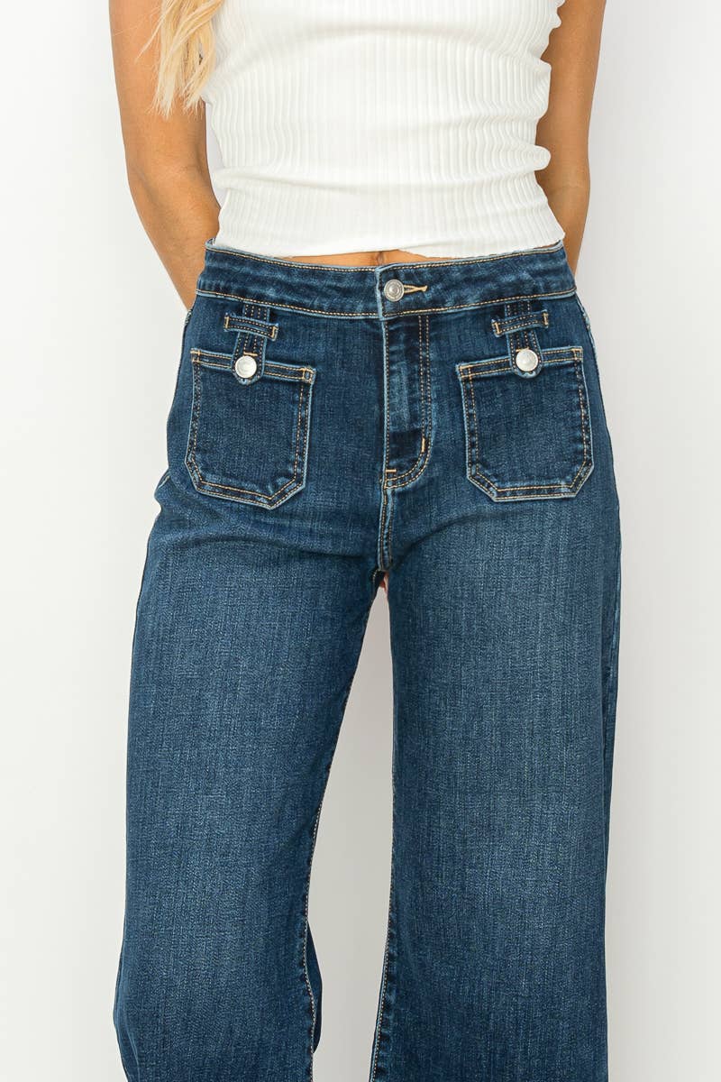These jeans are so cute! They are a cropped length with a dark wash. High-waisted and wide-legged with pocket detail on the front.