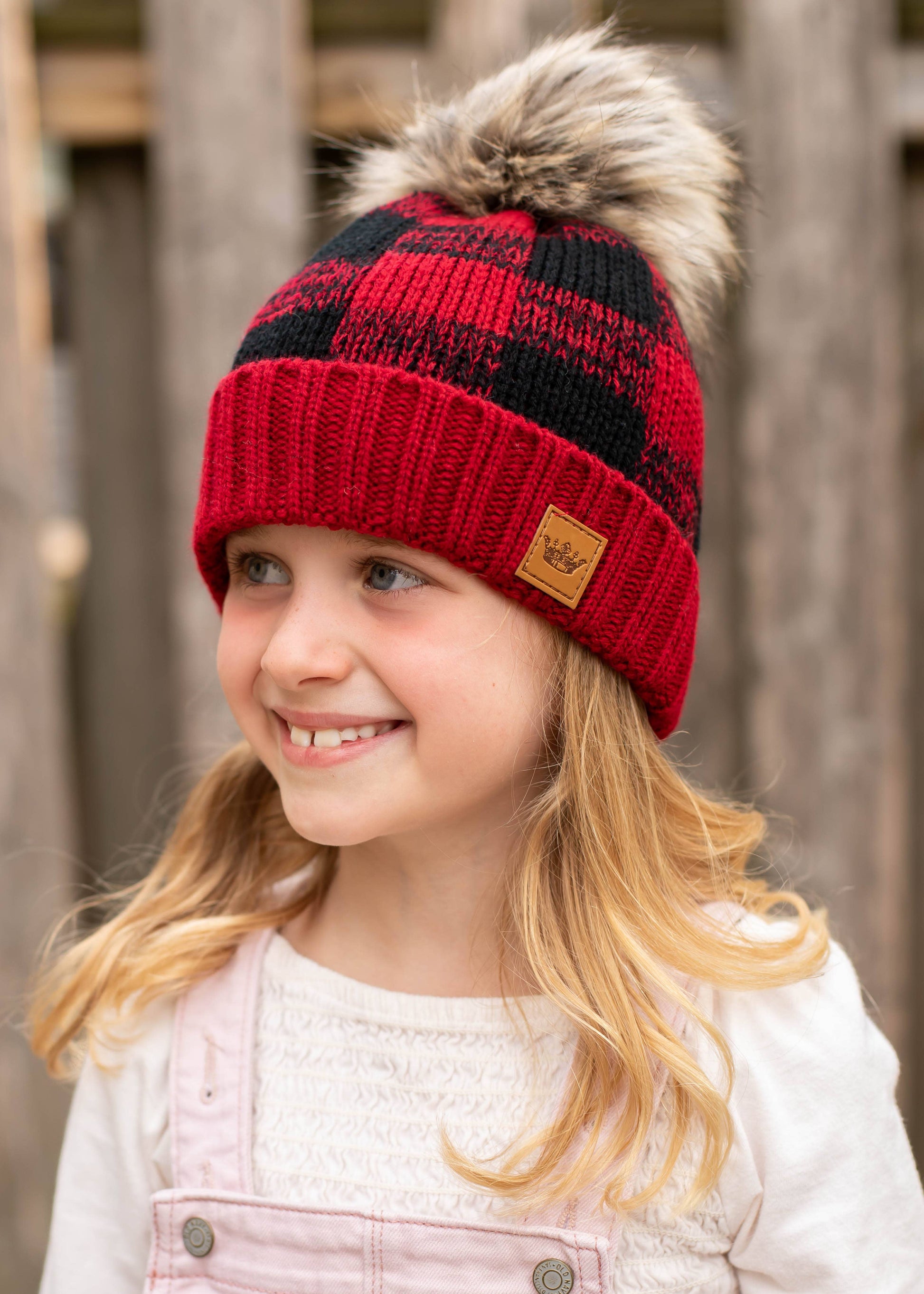 KIDS red & black buffalo plaid knit hat Natural faux fur pom detail Fleece lined