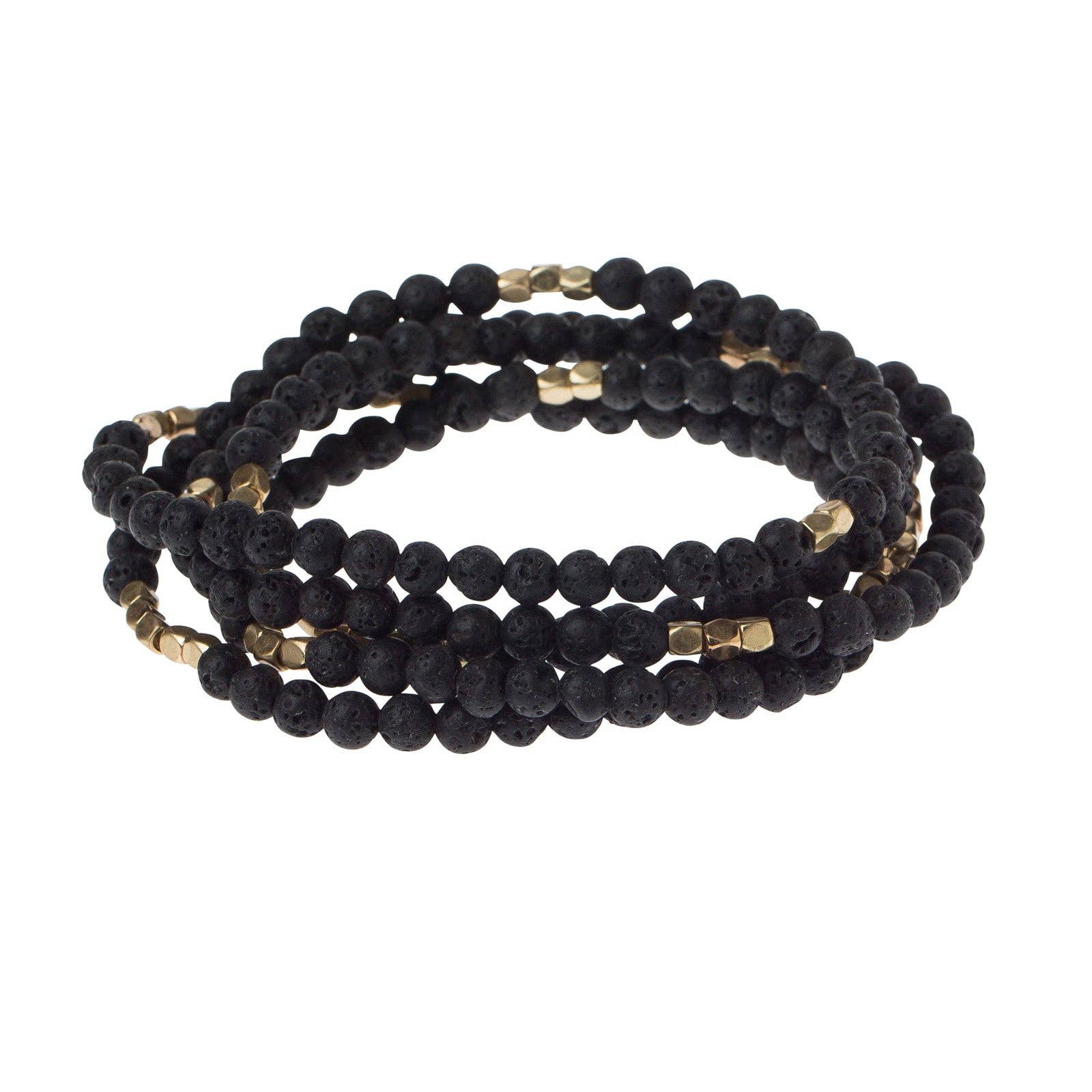 The bracelet becomes a necklace & Ta-Da! Tap into the energies of the earth. Semi-precious gemstones adorn the wrist & neckline. Effortlessly converts from bracelet to necklace. Can be wrapped 4-5 times as a bracelet and 1-2 times as a necklace. • 34" length • Materials: 4.5mm semi precious stone beads, plated brass, stretch cord • Presented on cards that tell the meaning of each stone: Lava Stone | Stone of strength. Said to contain the powerful energies of volcanoes that created the stone. Brings calming yet intense energy. Offers stability in times of change. Grounds the wearer to reality.