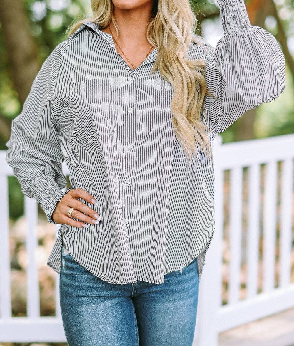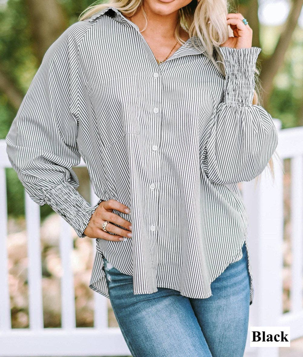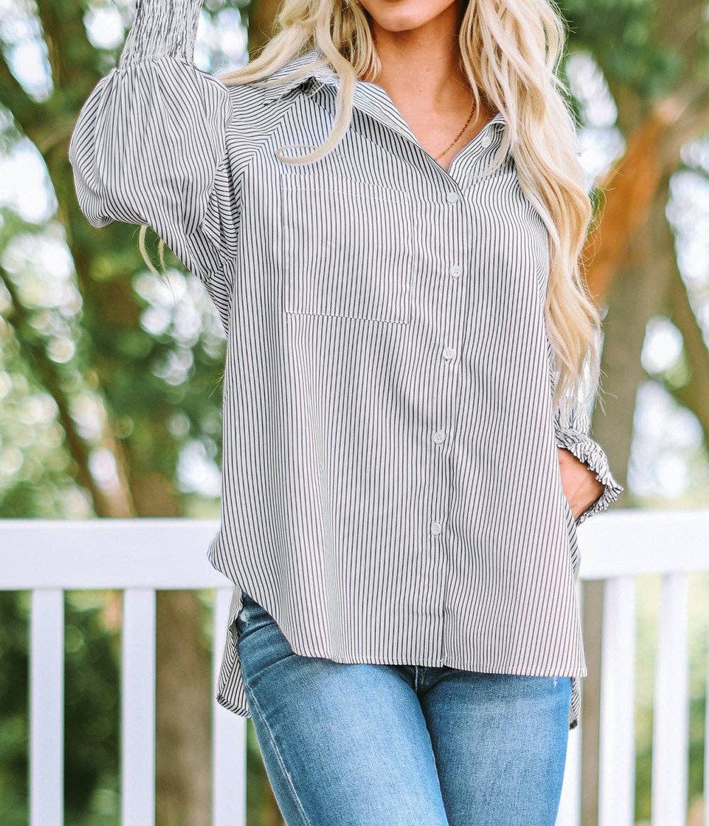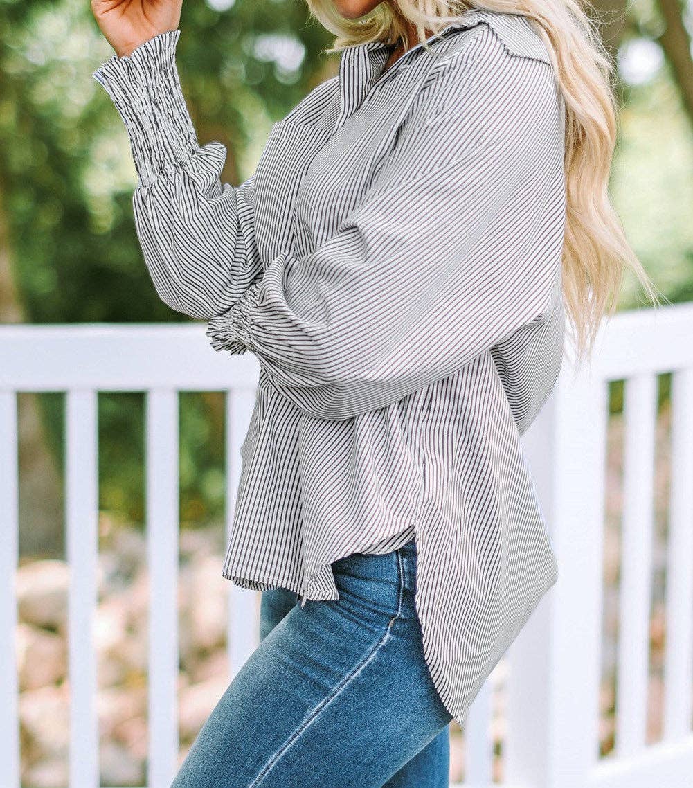 You will adore this relaxed comfortable top with smocked sleeve cuffs. It is a classic striped piece that is great for everyday wear and offers plenty of versatility. Paired with our cute Kancan white jeans or throw on our Sneak Peak Denim shorts for an effortless look.
