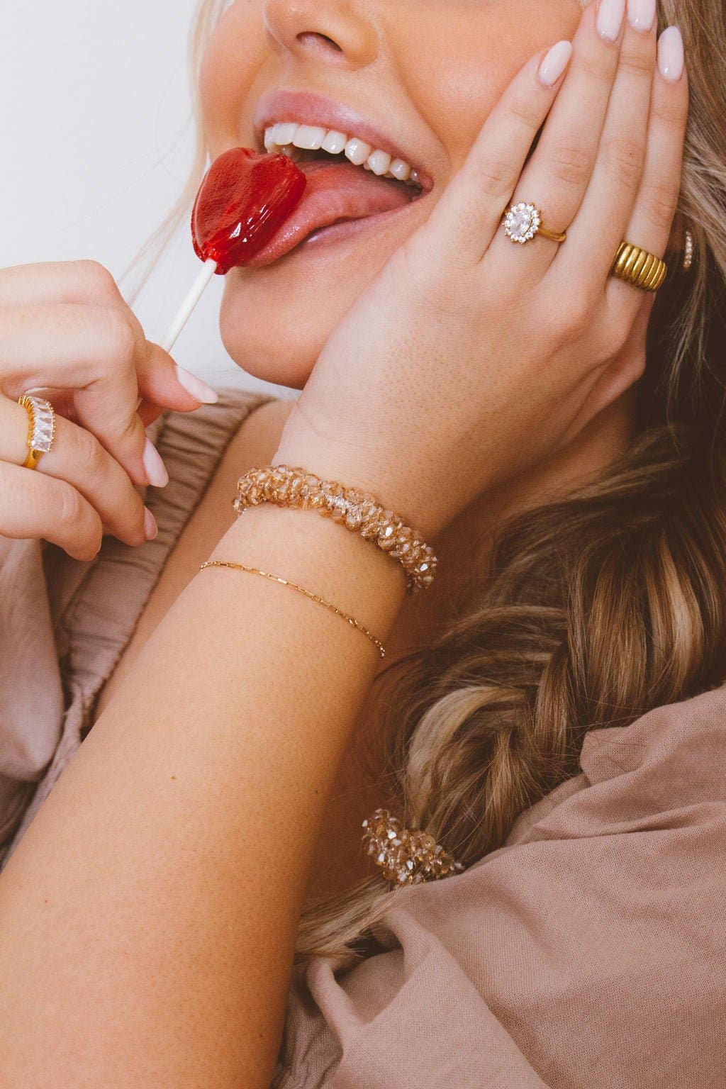 This jewel ponytail holder is the cutest thing to take your ponytail to the next level. It's a stretchy average ponytail size with the little golden beads attached so you can have the fanciest, cutest ponytail ever.