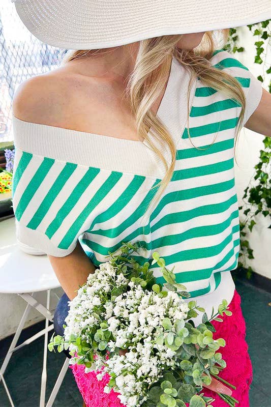 V-neck contrast rib stripe sweater top with Dolman sleeve. This is an essential for summer!