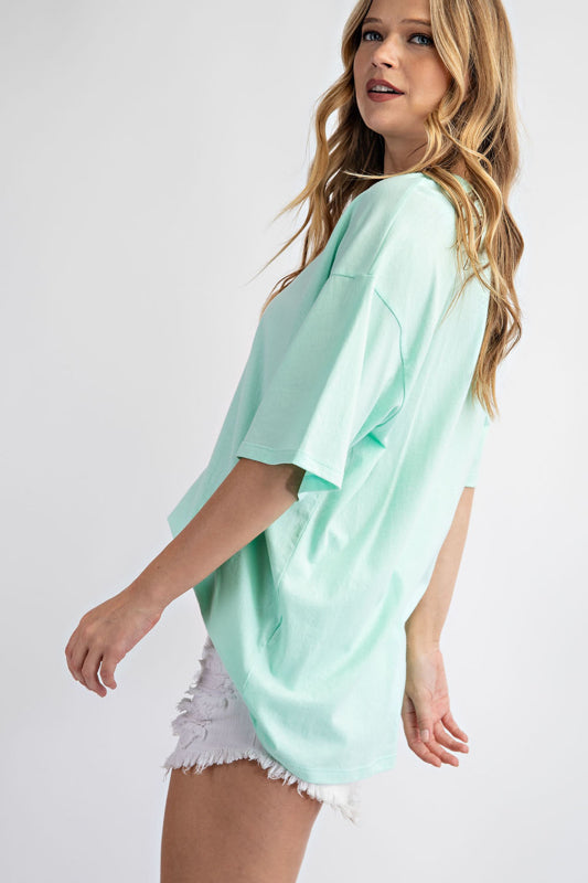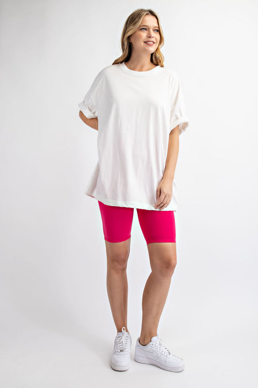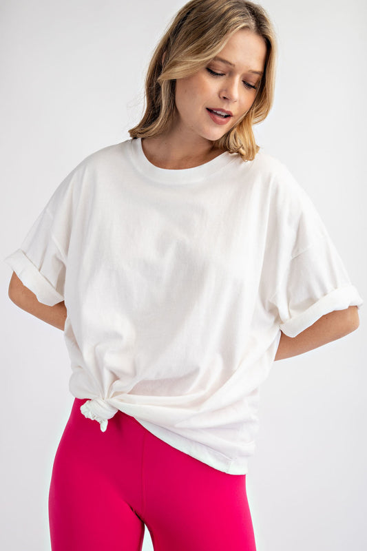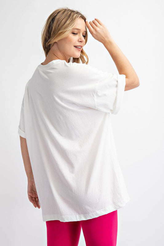 An oversized t-shirt with a great weight to be worn alone or paired with a cute denim jacket. This versatile top goes well with shorts, jeans or thrown over a pair of leggings with Uggs.